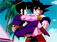 Chi-Chi takes care of Goku while he has his Heart Virus. When she sees Goku fully standing, she is overjoyed and runs to him and gives a big hug, to which he responds by swinging her around.