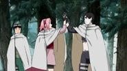 Tsunade finds the location of Orochimaru's hideout and sent Kakashi along with Team Kurenai to see it. They get into a fight with Guren and Shino sends back one of his crystallised bugs. Then Tsunade sends Yamato, Sai, and Sakura to help them along with Naruto who meets them along the way. Team Kakashi and Kurenai follow Guren and discover that the thing they were after was the Three-Tails. Shizune, Ino, Tenten and Lee are assembled to help with the hunt for the Three-Tails. They all meet up and split into to groups to seal the tailed beast in its own dimension and get Yūkimaru. The Sealing group, Team Three is Shizune, Hinata, Sakura, and Ino. The Guarding group, Team Two is Yamato, Tenten, Kiba, and Lee, while Team One the Fighting group is Naruto, Kakashi, Sai, and Shino.