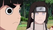 Later, Team Guy was caught in a massive sandstorm. Unable to push forward, Neji repelled with sand long enough for Tenten to summon a protective dome for them to wait out the storm. While waiting for the storm to settle down, Tenten told Lee to stop moving too much and he told her that he was sorry. Lee on the other hand complained for how long it will take for them to get out of the sandstorm, but Neji told them that they will have to wait to which Lee agree. Once the sandstorm did settle down, Neji informs Lee and Tenten, who are encouraged to head out to the direction of the tower, that they hold two heaven scrolls, noting that he didn't have a chance to tell his team-mates due to the recent events. Neji then uses his Byakugan to scout the surrounding area, catching the sight of a weary Matsuri. The three genin then run to the kunoichi's aid, with Lee mistaking Neji's intents and asking if he wants to steal the scroll from a shinobi in danger, only to be corrected by Tenten. As they approach Matsuri, she tells them that Gaara is in danger and asks them to go and help the Kazekage in battle.